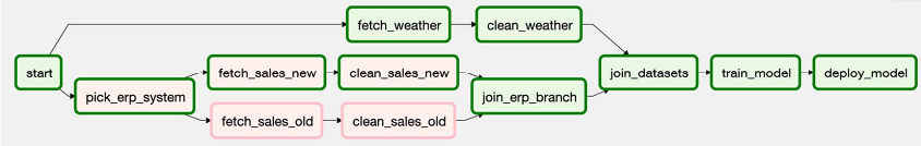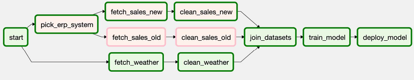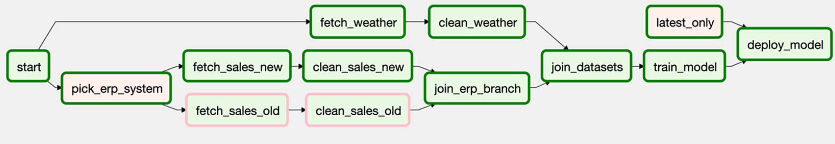 def _pick_erp_system(**context): if context["execution_date"] < ERP_SWITCH_DATE: return "fetch_sales_old" else: return "fetch_sales_new" pick_erp_system = BranchPythonOperator( task_id="pick_erp_system", python_callable=_pick_erp_system, ) start >> [pick_erp_system, fetch_weather] pick_erp_system >> [fetch_sales_old, fetch_sales_new] fetch_sales_old >> clean_sales_old fetch_sales_new >> clean_sales_new fetch_weather >> clean_weather [clean_sales_old, clean_sales_new, clean_weather] >> join_datasets join_datasets >> train_model train_model >> deploy_model- Since downstream tasks only get scheduled & executed if all thier downstream tasks finished successfully,
