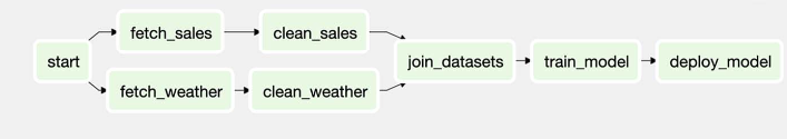 start >> [fetch_sales, fetch_weather] - This is how we can specify dependencies for the DAG in the above picture: