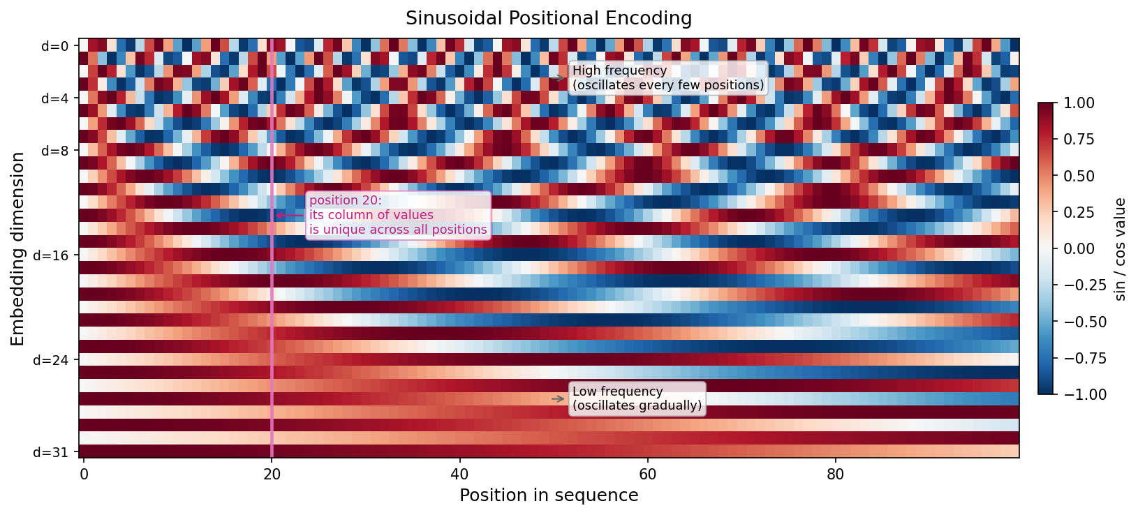 This multi-scale design is intentional. Low dimensions give the model a fine-grained signal that changes every few positions — useful for detecting whether two tokens are immediate neighbors. High dimensions give a coarse signal that changes only over long distances — useful for detecting whether two tokens are in the same half of the document. Together, the full vector is unique for every position from 0 to the maximum.