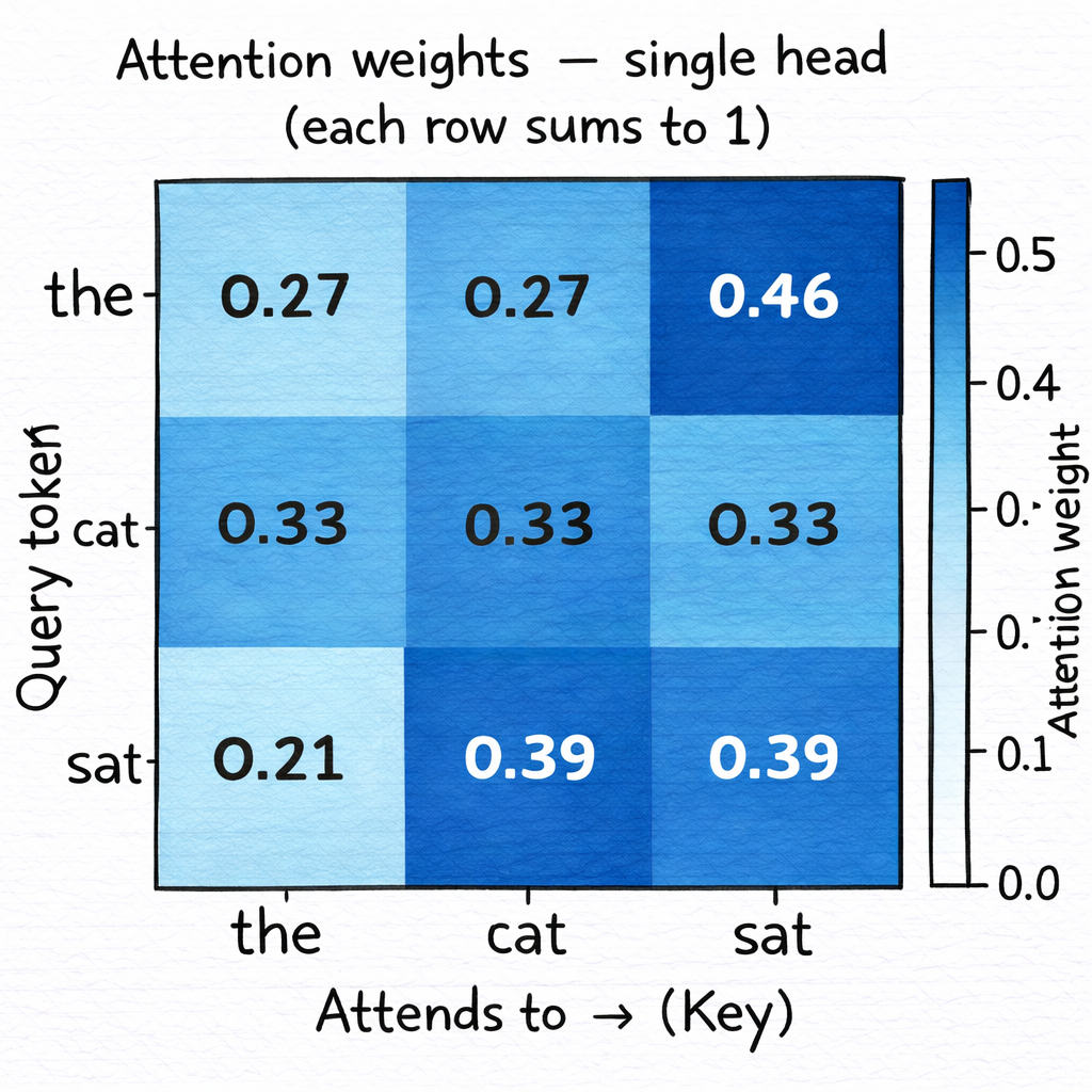 We’ll return to this library analogy throughout — it explains why Q, K, and V need to be separate projections, and what the attention weights actually represent numerically.