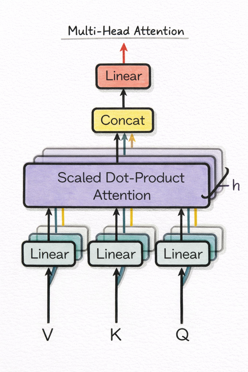 Multi-head attention gives the model multiple simultaneous perspectives. Each head operates in its own lower-dimensional subspace and learns to track different relationship types: one head for syntax, one for coreference, one for local context. This specialization is emergent — it arises from the training signal, not from any explicit design constraint.