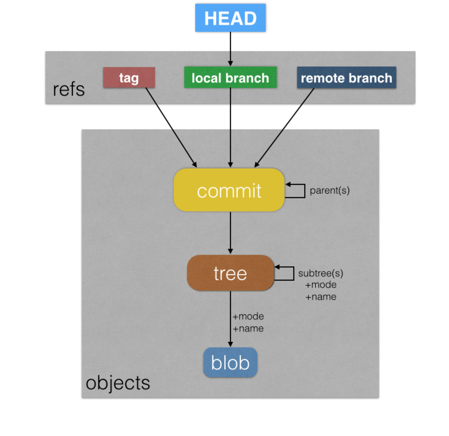 Tree objects themselves do not have names, much like blobs. Parent trees associate names for subtrees, and the root tree, referred to as the “working tree” of a repository, in fact has no name. This has two fun characteristics: